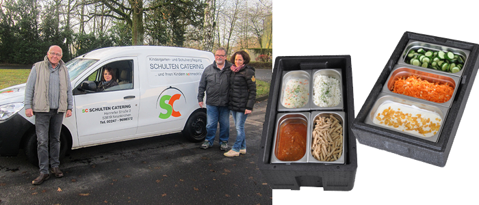 Die Anlieferung der Speisen erfolgt in Gastronom-Edelstahlbehältern. Warme Speisen werden mit mindestens 65° C, kalte Speisen mit höchstens 7° C übergeben. Die Speisenbehälter sind verschlossen in Thermoport-Transportbehältern verpackt. Die Ausgabe bzw. das Anrichten der Speisen erfolgt – sofern nicht anders vereinbart – durch den Auftraggeber.